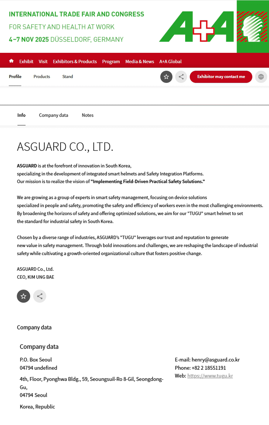 홈페이지 확인 ASGUARD CO., LTD. of Seoul at A+A 2025 in Düsseldorf -- A+A Trade Fair -->